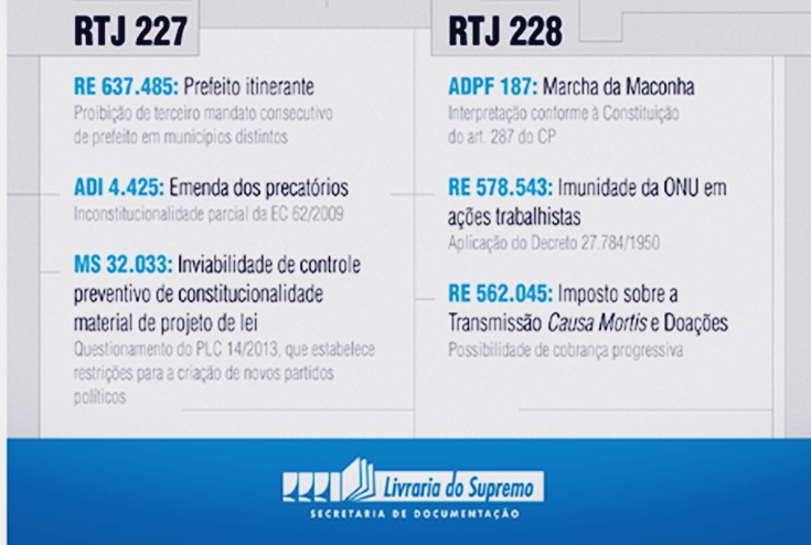Além do livro de teses, merece destaque também a RTJ – Revista Trimestral da Jurisprudência. Ela já está no volume 228 e, obviamente, é um compilado com a jurisprudência de 3 meses dos Ministros do STF.
