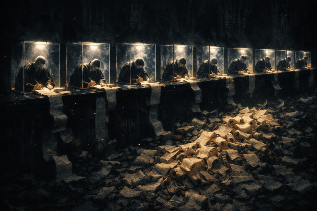 Como notou Georges Abboud com precisão cirúrgica, o resultado é um tribunal que não delibera — apenas agrega votos.¹⁴ Os membros da corte não chegam a um consenso argumentativo: chegam a um resultado numérico. A jurisprudência não é construída coletivamente por meio do diálogo entre os julgadores; ela é a soma de posições individuais que, acidentalmente, formam maioria. Isso cria uma patologia específica: a fundamentação personalista, em que a decisão da corte não tem uma ratio decidendi clara e coesa, mas uma série de razões individuais muitas vezes contraditórias, que coexistem no mesmo acórdão sem jamais terem sido efetivamente confrontadas e harmonizadas.
