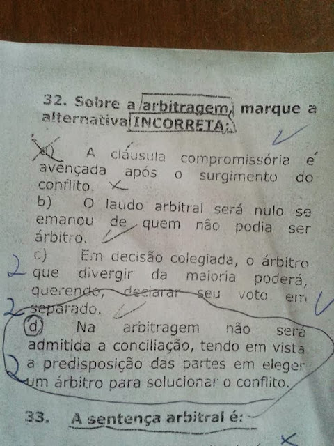 Mas o Guilherme conseguiu fazer e obter as notas. No total ele faz 14 provas, sendo 4 peças práticas, e a monografia, obtendo aprovação em todas, menos na matéria Conciliação, Mediação e Arbitragem, na qual HOUVE UMA QUESTÃO EM QUE CABEM DUAS RESPOSTAS! Ora, uma questão com duas respostas é nula de pleno direito, não havendo margem para discussão. (Logo após o texto segue a foto da questão da prova que possui duas respostas por meio da qual a instituição deseja reprovar o aluno e a relação das matérias com a respectiva pontuação. PERCEBAM, A COLAÇÃO DE GRAU DO ALUNO DEPENDE APENAS DA ANULAÇÃO DA QUESTÃO (Nº 32), QUE JÁ É NULA DE PLENO DIREITO POIS, REITERANDO, POSSUI DOIS GABARITOS. Analise e decida, você mesmo, se é o caso de incompetência ou de má-fé.