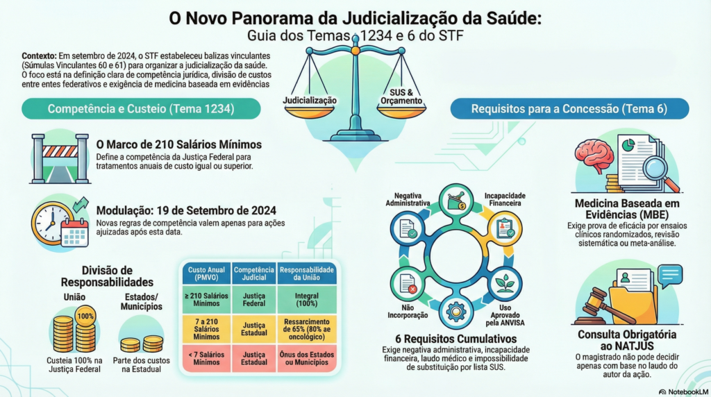 O julgamento dos Temas 1234 e 6 pelo STF, acompanhado da edição das Súmulas Vinculantes 60 e 61, representa o mais significativo avanço normativo na judicialização da saúde brasileira desde a Audiência Pública nº 4, realizada em 2009. A Corte não apenas definiu critérios objetivos de competência e custeio — como o patamar de 210 salários mínimos aferido pelo PMVG —, mas também elevou o patamar probatório ao exigir evidências científicas de alto nível, alinhando o Judiciário à medicina baseada em evidências.