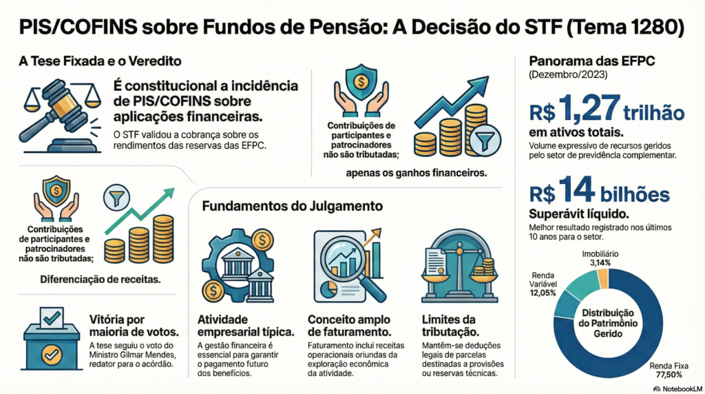 O recurso foi reconhecido como de repercussão geral (Tema 1.280), com a seguinte questão constitucional: exigibilidade do PIS/COFINS em face das entidades fechadas de previdência complementar, tendo presentes a Lei 9.718/1998 e o conceito de faturamento, considerando-se a redação original do art. 195, I, da Constituição Federal.