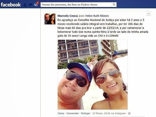 “Eu agradeço ao Conselho Nacional de Justiça por estar há 2 anos e 3 meses recebendo salário integral sem trabalhar, por ter 106 dias de férias mais 60 dias pra tirar a partir de 23/03/14, e por comemorar e bebemorar tudo isso numa quinta-feira à tarde ao lado de minha amada gata de 19 anos! Longa vida ao CNJ e à Loman [Lei Orgânica da Magistratura Nacional]!”, escreveu na legenda de uma delas.