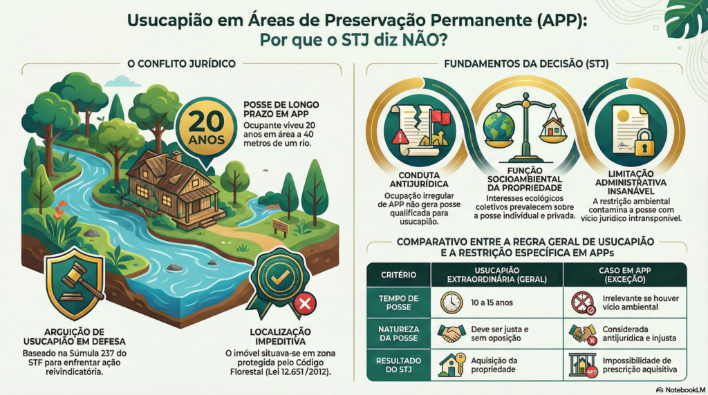 Não é possível o reconhecimento de usucapião sobre imóvel situado em Área de Preservação Permanente (APP). A ocupação irregular dessas áreas constitui conduta antijurídica que não gera posse qualificada para fins de prescrição aquisitiva, ainda que demonstrado o exercício da posse pelo prazo legal. A limitação administrativa que recai sobre as APP, embora não transforme o imóvel em bem público, impede que invasões e ocupações irregulares produzam efeitos jurídicos válidos, sob pena de se estimular a violação da legislação ambiental e da função socioambiental da propriedade.