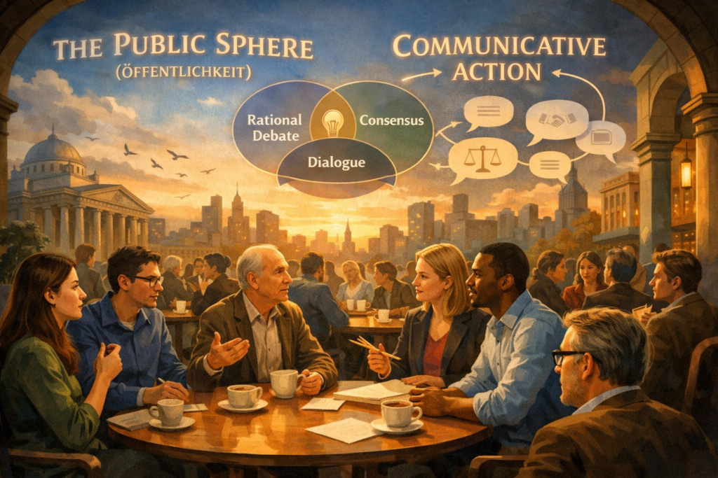 A primeira grande contribuição de Habermas, elaborada em Strukturwandel der Öffentlichkeit (1962), introduziu o conceito de esfera pública burguesa, compreendida como o espaço social onde indivíduos privados se reúnem como público para discutir racionalmente questões de interesse geral.