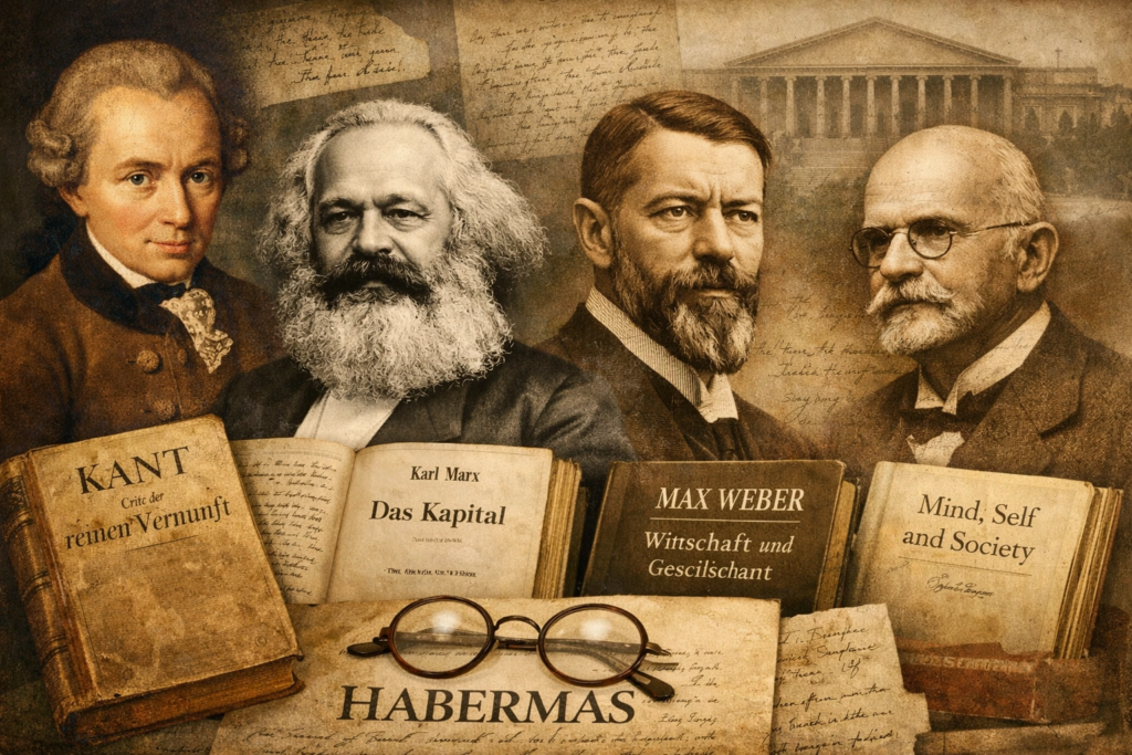 Da Escola de Frankfurt (Adorno, Horkheimer), herdou o projeto da Teoria Crítica e a crítica do positivismo, mas rejeitou o pessimismo sobre a razão.